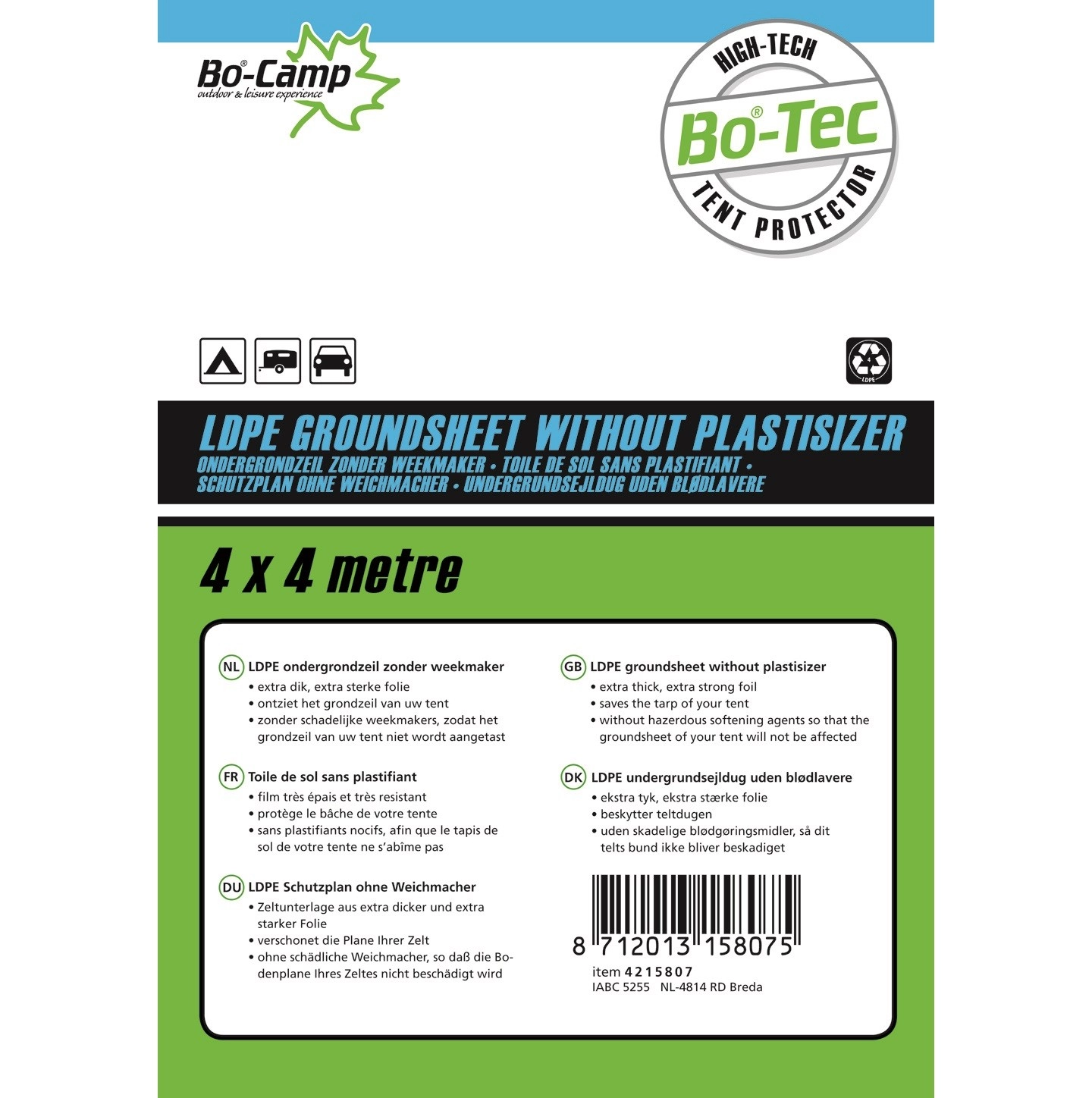 Extra sterk ondergrondzeil. Zorgt dat het grondzeil van de tent niet vies wordt en dat optrekkend vocht wordt tegengehouden, zodat alle kampeerspullen droog blijven. Ook handig om iets mee af te dekken tegen de regen. Bevat geen weekmakers zodat de coating van het grondzeil niet wordt aangetast. Gemaakt van 0,03 millimeter ‘low density polyethyleen’ (LDPE).