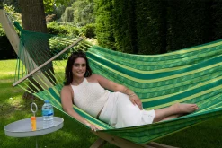 Deze fijne hangmat is afkomstig uit de Double Lazy serie van Tropilex. De hangmat is vervaardigd van 100% Polycotton, een speciale combinatie van katoen en polyester waarbij de stof dikker is geweven. Hierdoor is de hangmat zeer sterk en duurzaam, zo gaat deze lang mee. Daarnaast zorgt de stof er voor dat de hangmat zacht en comfortabel aanvoelt. De stof is tevens geschikt tegen een lichte regenbui, wanneer de hangmat niet wordt gebruikt, wordt geadviseerd de hangmat op een droge plek te bewaren. De hangmat heeft een maximaal draaggewicht van 180 kg en is geschikt voor maximaal twee personen. De hangmat heeft een fijne grote oppervlakte van 220 x 140 cm, waar u heerlijk in kunt ontspannen. De hangmat wordt geleverd exclusief standaard of bevestiging set.