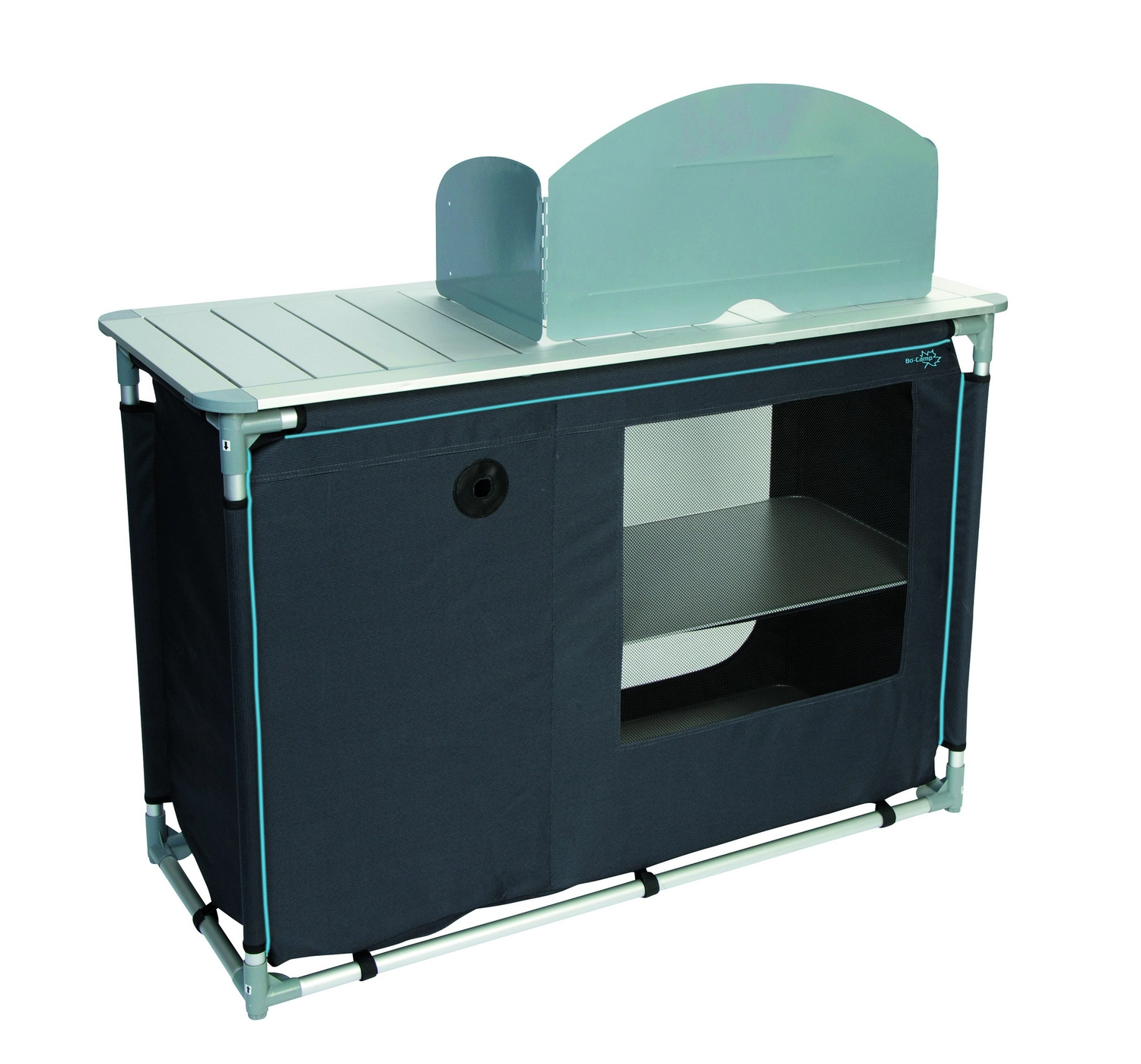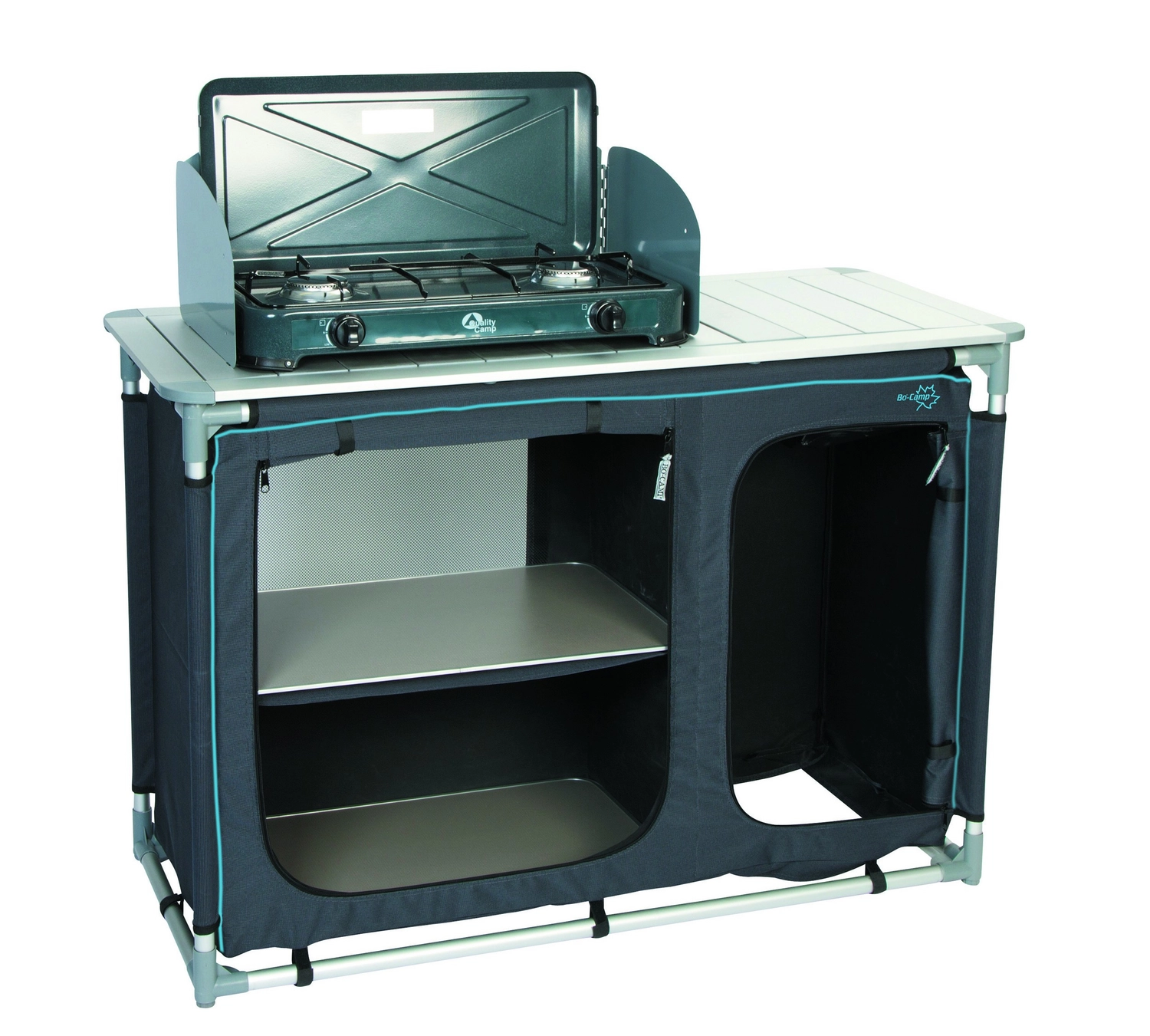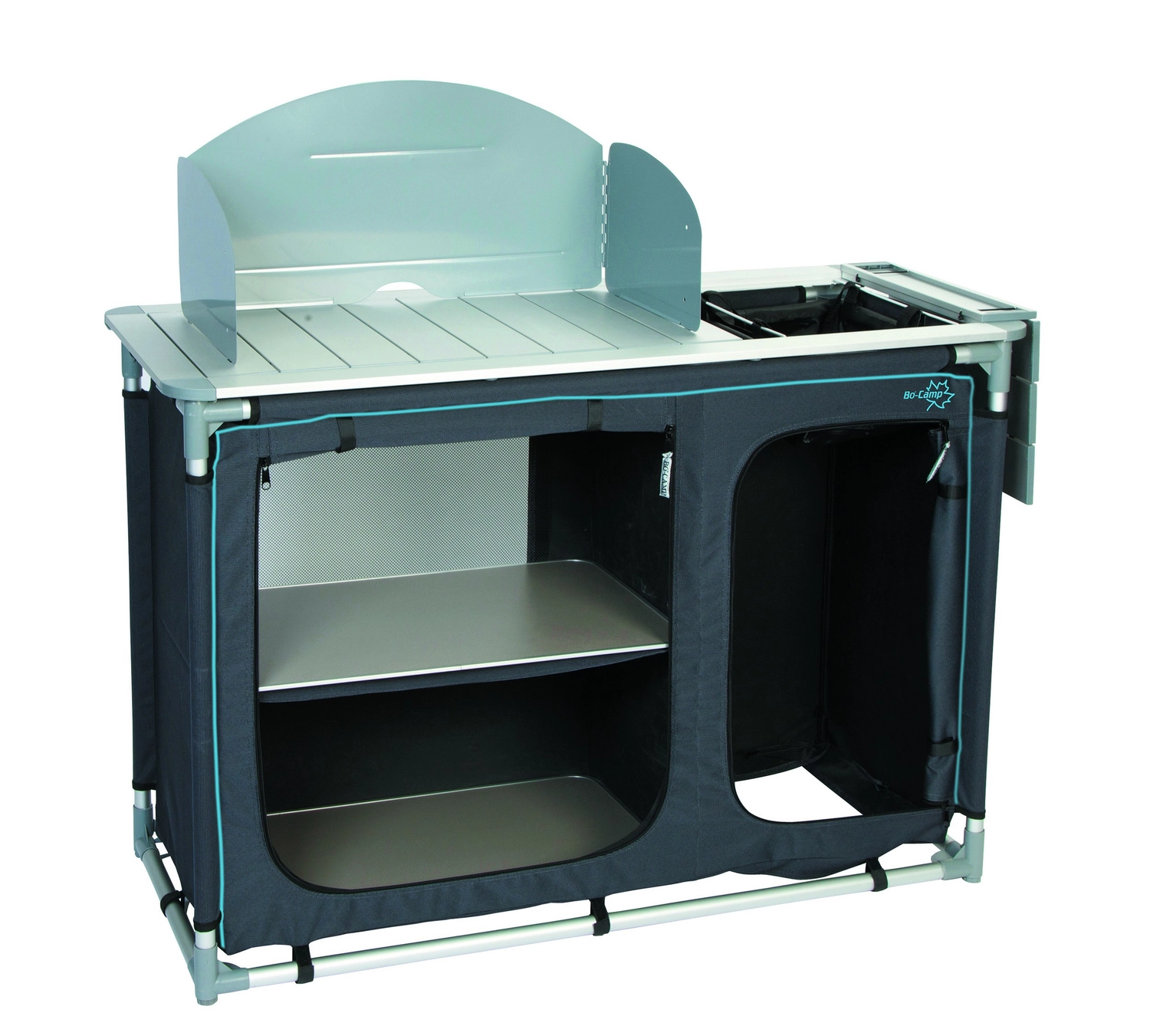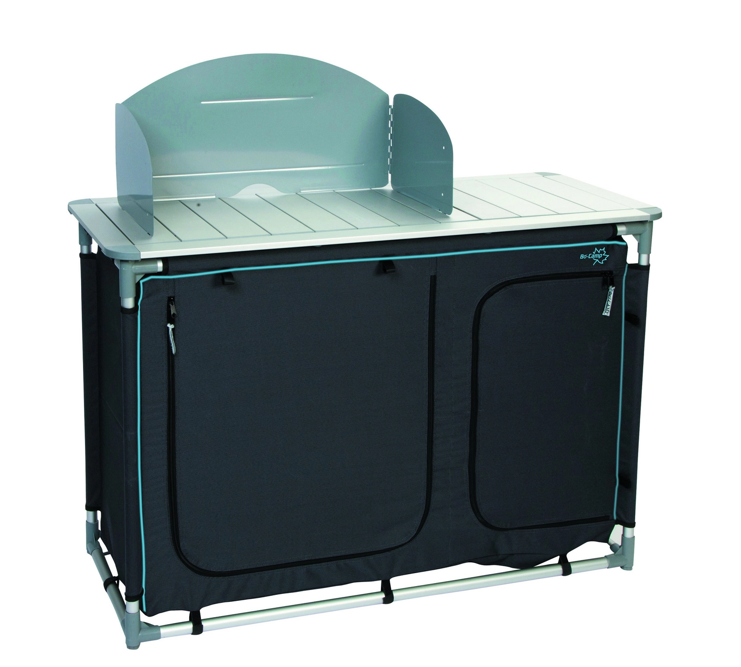 Dit zeer luxe kookeiland beschikt over een wasbak en is afkomstig van het merk Bo-Camp. De afmetingen zijn 117 x 50 x 80 centimeter en het kookeiland is voorzien van een extra stevige 600 denier polyester hoes met daarin 2 handige legplanken. Bovendien bevindt zich aan de rechterzijde een opening met gasfles. Het oplegblad van dit kookeiland is watervast, hittebestendig en voorzien van een windscherm. Het is geschikt voor een 4-pits gaskomfoor. De afzonderlijk verstelbare poten zorgen ervoor dat het kookeiland op elke ondergrond stabiel staat. Wordt geleverd in een draagtas. Ingeklapt (lxbxh): 121x41x41 centimeter.