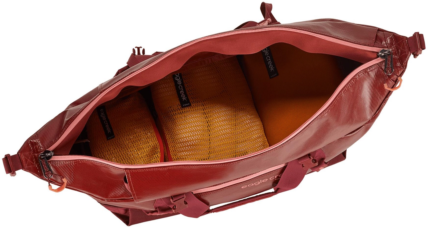 Deze reistas komt uit de serie Migrate duffel van het merk Eagle Creek. De reistas heeft een uitgebreide capaciteit van 44 liter en bevat een grote opening met een interne stormflap. De zijgespen kunnen ontgrendeld worden om nog een extra 5 liter vrij te geven. Externe compressieriemen houden de uitrusting op hun plek en de versterkte handgrepen dienen ook als bevestiginglocaties. De bodem is gemaakt van kunststof van voorruiten uit stortplaatsen. Deze bevat een naadloze bodembadconstructie zodat wanneer u de tas in een plas neerzet er geen water binnen komt. De reistas is om te toveren tot een backpack door de rugzakriemen los te maken. De tas is voorzien van een voorvak met ritssluiting en is compact op te vouwen voor opslag. De ritssluiting bevat grote lussen zodat deze ook met handschoenen aan gemakkelijk open gemaakt kan worden.